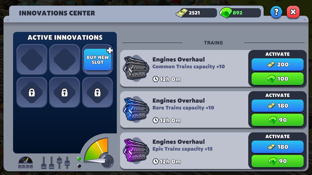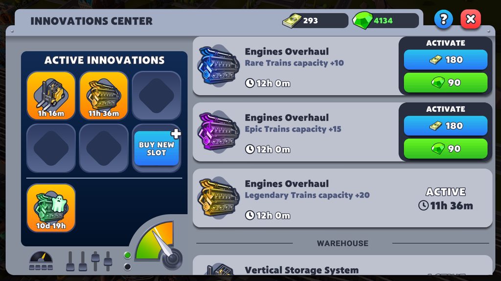 On first launch of the Innovations Center only 2 boost slots appear as available. However, you can purchase additional slots up to a maximum of 6. All active boosts run concurrently. Active boosts cannot be deactivated before their timer runs out. So chose wisely based on your current gameplay requirements!